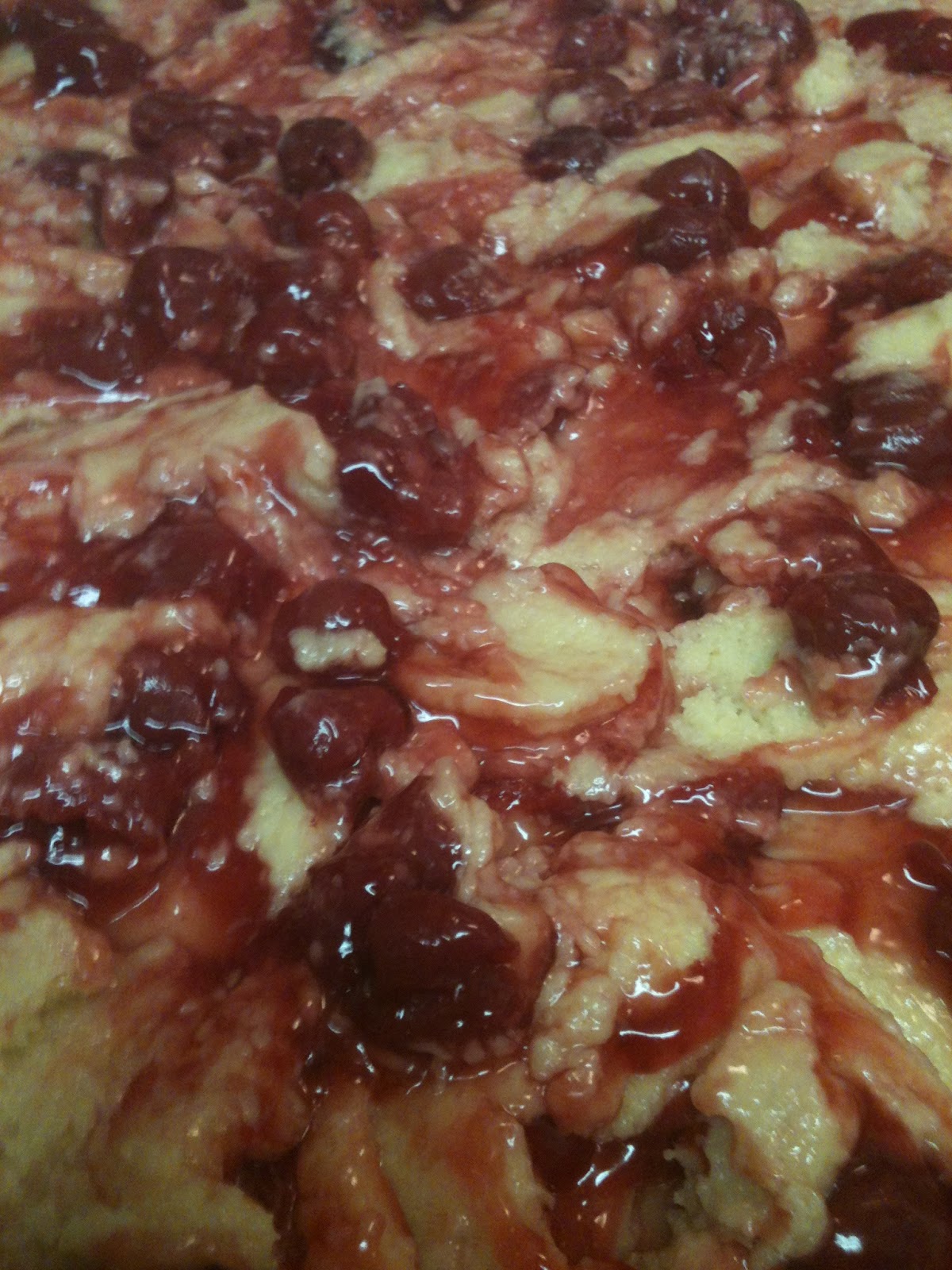 With the remaining 1/3 of the mixture, scoop balls of dough on top of the pie filling. Then marble mix it up with a knife. Be as messy as you want, but make sure you don't go all the way to the pan. You don't want the pie filling to burn to the bottom and mess up your bars. I mean it when I say the messier the better! Here's what mine looked like before I put it in the oven.